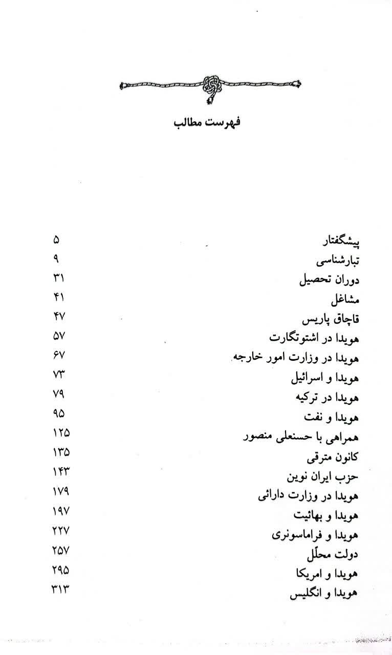 کتاب با عنوان تبارشناسی به وضعیت خانوادگی و آیین و مذهب هویدا اشاره میکند، دوران تحصیل و مشاغل او را تشریح میکند و به حضور او در اشتوتگارت، وزارت امور خارجه، اسرائیل و ترکیه میپردازد. کتاب قصه هویدا پس از این به حضور هویدا در عرصه سیاست اشاره میکند. پیوند بین هویدا و نفت و همراهی او با حسنعلی منصور سرآغاز درخشش سیاسی او به شمار میآیند. عمر سیاسی هویدا در وزارت دارائی و دوگانههای هویدا و بهائیت، هویدا و فراماسونری، هویدا و آمریکا و هویدا و انگلیس در ادامه کتاب بررسی میشوند. در نهایت صفحات پایانی کتاب از ازدواج، خصلتها و سرانجام نخست وزیر رژیم پهلوی میگوید.