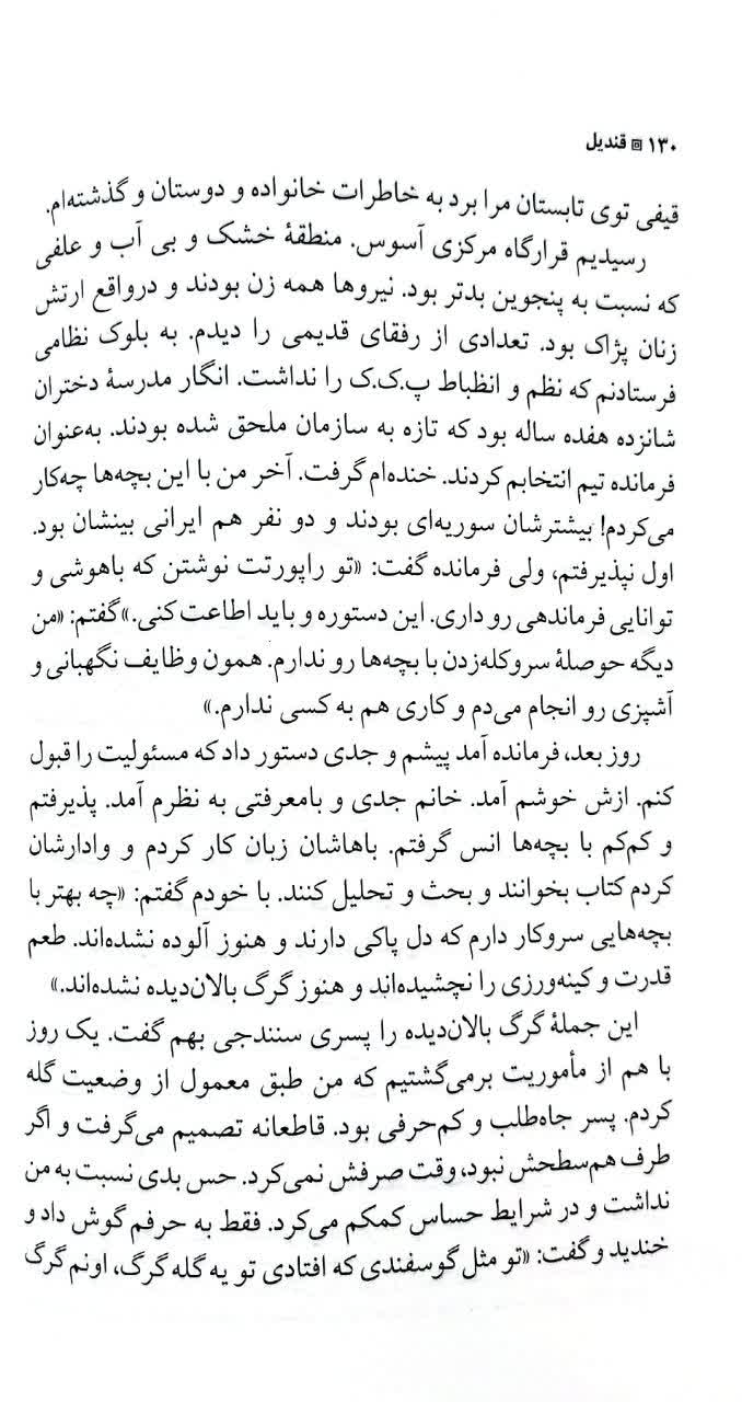 یخ کردم و بدنم سست شد مات و مبهوت نگاهش کردم. فرمانده ادامه داد: «هه وال بهار اگه میخوای تو هم اتهام جاسوسی نخوری و مجازات نشی، سرتو بنداز پایین و هر دستوری میدن انجام بده که مورد سوءظنی و دشمن زیاد داری» پرسیدم: «الان سیروان کجاست؟» گفت: ایرانه ولی پیداش میکنیم و حالشو جا میآریم. باید بفهمیم شماها با چه نیت و هدفی آمدین اینجا و چرا بعد از مدتی فرار میکنین.