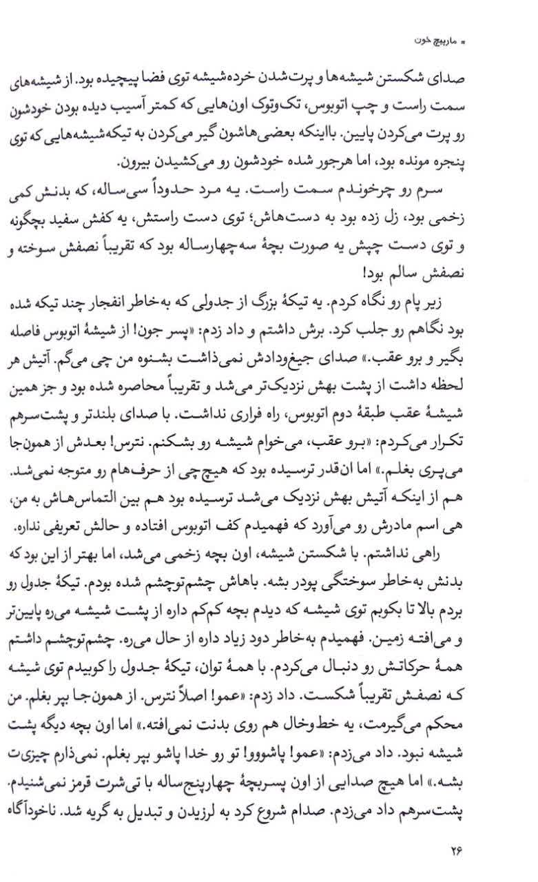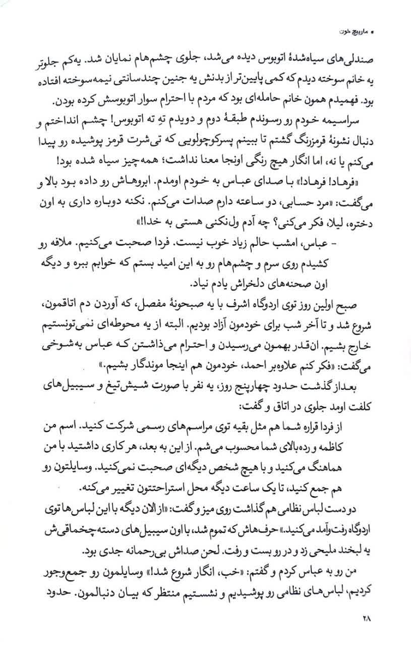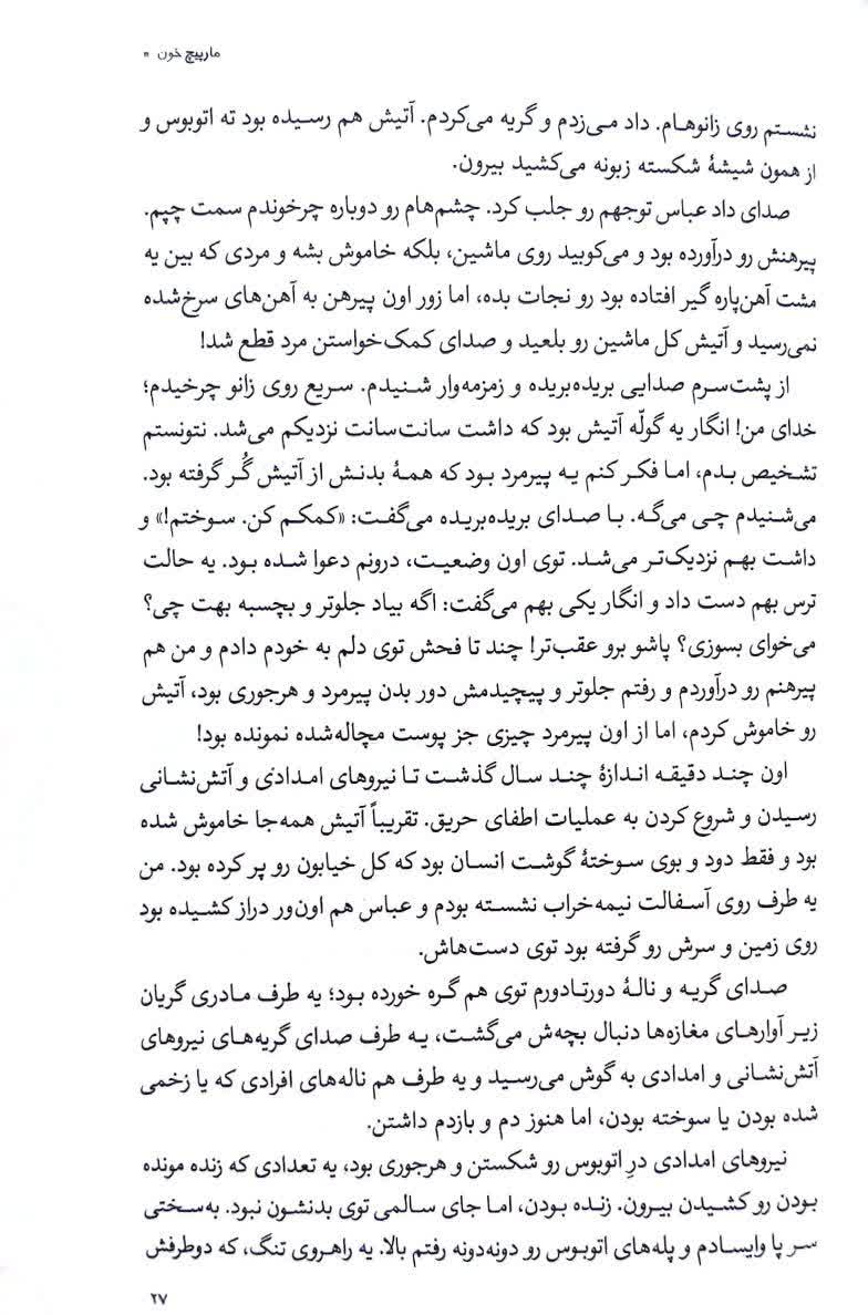 من هم مجبور شدم تصمیمم رو بگیرم از یه طرف، خاطرات مسعود از دخترش و از طرف دیگه نگرانی از اینکه اگه عباس هم کشته بشه، عملاً عملیات میره هوا باعث شد از پشت جعبهها بیام بیرون و شروع کنم به تیراندازی. داد زدم عباس من نمیذارم بیاد جلو. مسعود رو بکش عقب. چند ثانیهای که عباس برسه به مسعود اندازه چند سال گذشت اما بالاخره انگشتهای دستش رو حلقه کرد دور مچ مسعود و با همه زورش مسعود رو کشید سمت خودش، از این ور شلیک رو قطع نمیکردم. البته رگبار نمیزدم فقط تک تیر و با فاصله زمانی کم میزدم که هم مهماتم تموم نشه هم کسی نتونه بیاد سمت در. مسعود سنگین شده بود و عباس نمیتونست اون رو با سرعت بیشتری بکشه سمت خودش. نگاهم یه لحظه افتاد به پایین در؛ تیکه تیز در آهنی که براثر انفجار شکل گرفته بود رفته بود توی دل و روده مسعود گیر کرده بود و عباس هر چی زور میزد تکون نمیخورد.
