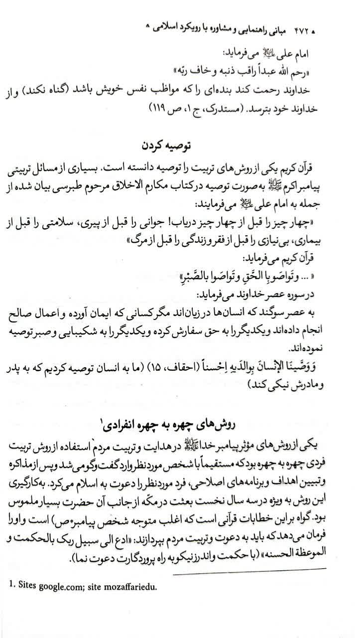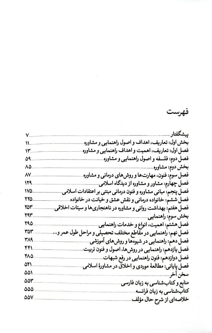 فصلهای اول و دوم کتاب با هدف تحقق مشاوره اسلامی به فلسفه و اصول، تفاوتها و تمایزات مشاوره تخصصی و مشاوره اسلامی میپردازد. فصل سوم کتاب مهارتها و روشهای درمانی از دیدگاه اسلامی را بررسی کرده است. مهدی حسینی در تدوین این فصل از آیات و روایات اسلامی بهره جسته است.