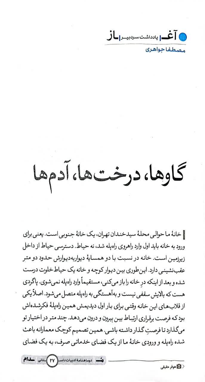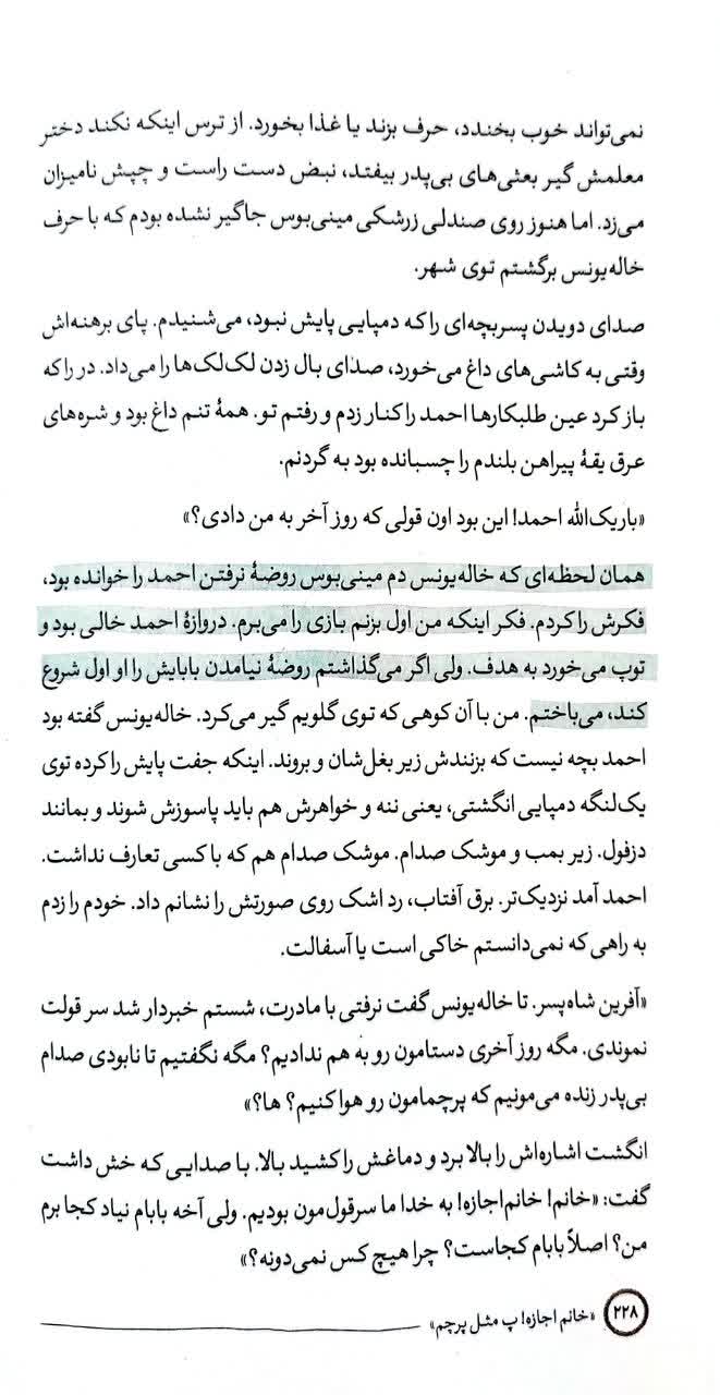 از دفعه پیش تا حالا اتوبوس فرقی نکرده و معلوم است که نظر سنجیهای شاگرد غلام شوفر هیچ وقت قرار نیست چیزی را درست بکند. پردههای قرمزرنگ مخملی هنوز بوی گرد و خاک میدهند. روکش صندلیها پارهتر از قبلاند و قفل شیشهها همان جایی است که نباید باشد. از پشت شیشه به غلام شوفر نگاه میکنم. مچ دست را بالا آورده و ساعتش را به شاگردش نشان میدهد. در همین حین ضربهای محکم به پهلویم میخورد. ناخودآگاه «هین» بلندی میکشم.