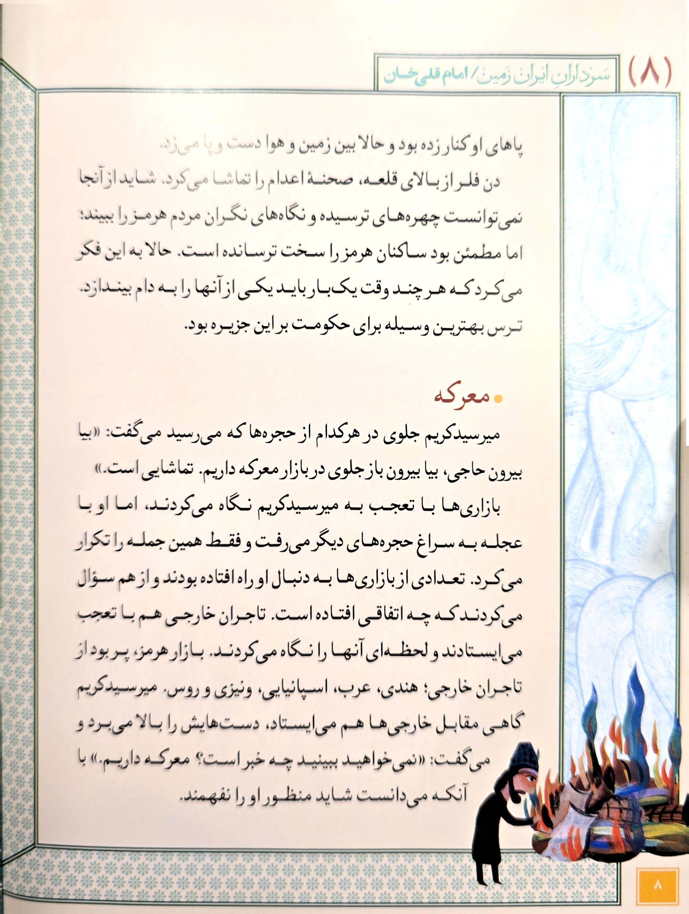 جلد هشتم این مجموعه برشی از زندگینامه امام قلی خان را روایت میکند. امام قلی خان سردار بزرگ سپاه ایران بود که علاوه بر جنگ با عثمانیها توانست جزیره قشم، هرمز و بندر عباس را از چنگال پرتغالیها آزاد سازد.