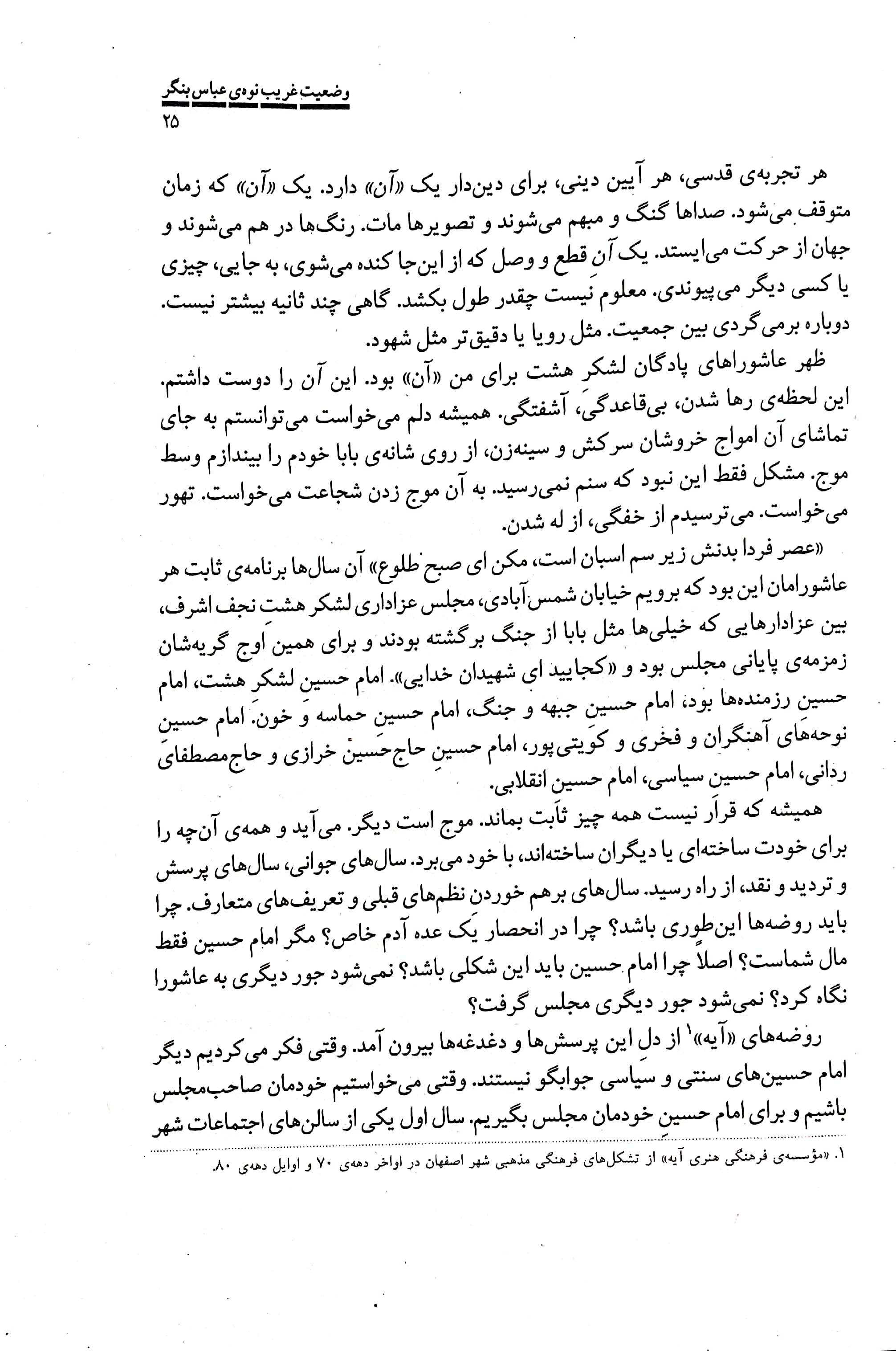 عمو آن روز رفت و بخشی از زندگی ما را با خودش برد. اولش همه گفتند این بار هم مثل دفعههای قبل یکی دو ماه دیگر سر و کلهاش پیدا میشود. یکی دو ماه شد پنج شش ماه عمو نیامد. همه افتادند به تلاش و تقلا همه جا پر بود از «کربلای پنج» و «شلمچه». نامهایی که نمی دانستم یعنی چه. گفته بودند دیدیم تیر خورد به پهلویش ولی ندیدیم شهید شود. تیر به پهلو آدم رو شهید میکنه؟ این شده بود سوال اساسی زندگیام. آی تویی که میگی دیدی تیر خورده نمیشد دستش رو بگیری با خودت بیاریش خودم توی دل خودم جواب میدادم «نمی شده لابد» دوباره میگفتم:«میشده اگه میخواستند» یکی از آینه بینها گفته بود بر میگرده. امیدی را که توی این کلمه بود دوست داشتم. یکی دیگرشان گفته بود:«دارم میبینم که تیر خورده افتاده بعد اونجا رو زدند و تل خاک ریخته روش مونده زیر خاکها. به این جای قصه که میرسیدیم میرفتم روی خاکها دنبال جملهاش میگشتم نبود.