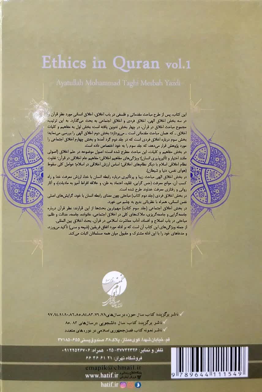 کتاب اخلاق در قرآن در جلد اول خود دو موضوع اساسی را از نظر گذرانده است: رابطه انسان با خود و خدا. این کتاب به قلم علامه محمدتقی مصباح یزدی یکی از مجموعه کتابهای مشکات است که بر مبنای آیات کریمه درصدد رشد اخلاقی مخاطب است.