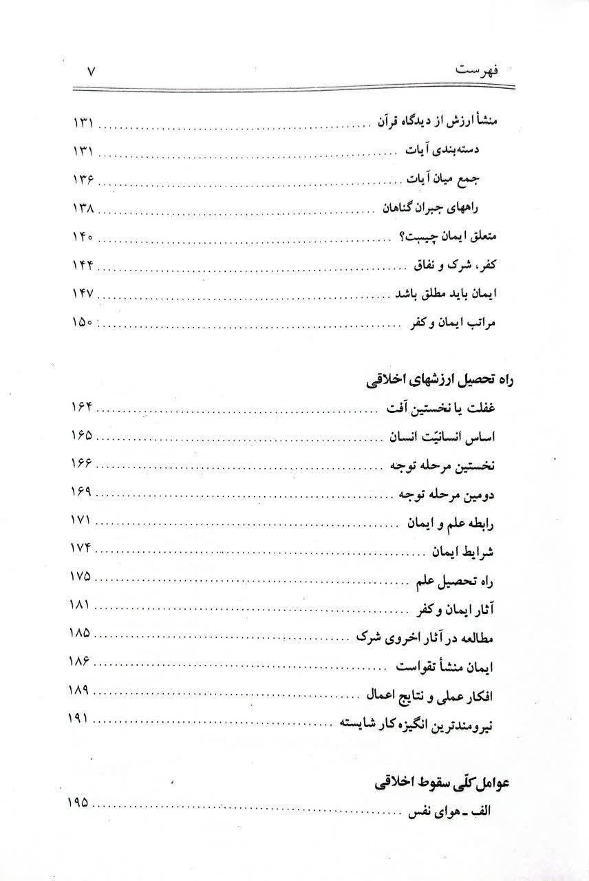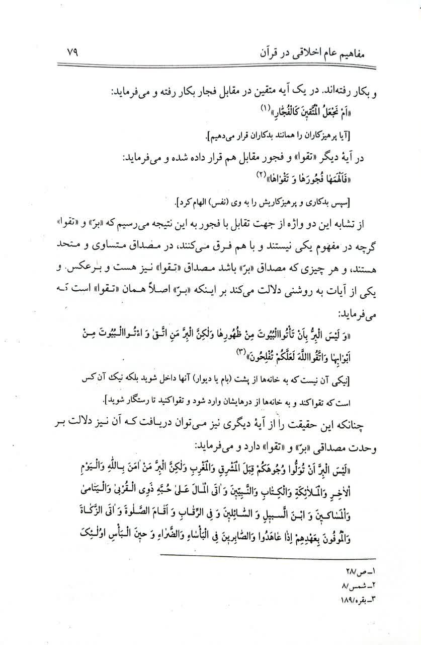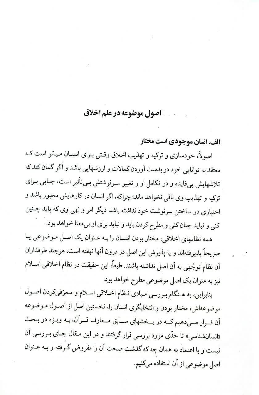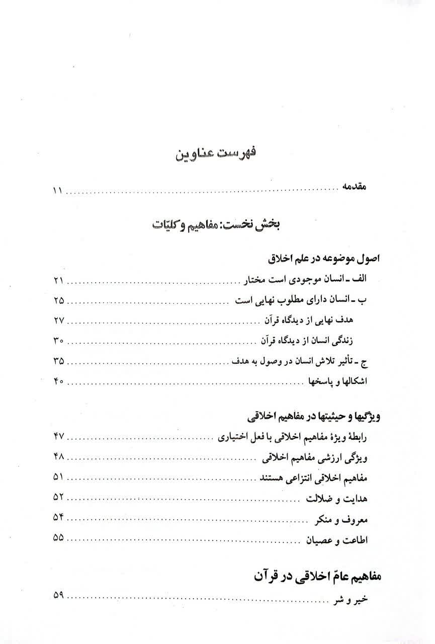 کتاب در ادامه به رابطه مفاهیم اخلاقی با فعل اختیاری اشاره میکند و از انتزاعی بودن مفاهیم اخلاقی میگوید. پس از این مفاهیم عام اخلاقی چون خیر و شر، معروف و منکر، حق و باطل، تقوا، احسان، عدل، ظلم و نور و ظلمت میپردازد. فصل سوم کتاب تفاوت نظام اخلاقی اسلام با دیگر نظامها را حلاجی میکند. اسلامی که برای انسان دو بعد جسمانی و روحانی متصور است و او را متصل به جهانی ابدی میداند در جهانبینی اسلامیاش خدا را محور قرار میدهد. این را قرار بدهید در کنار مکاتب غربیای چون اومانیسم و کاپیتالیسم که فراتر از ماده را برای انسان قابل تصور نمیداند.