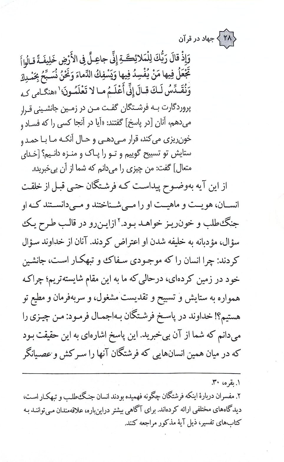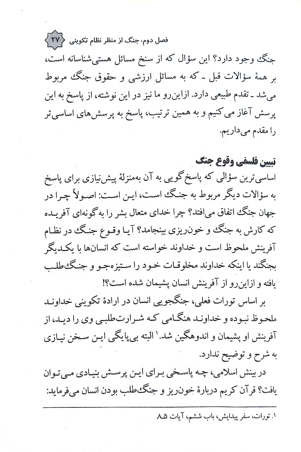 فصل دوم کتاب جنگ را از منظر نظام تکوینی مینگرد. در این فصل با تبیین فلسفی وقوع جنگ روبهرو میشویم، به نسبت جنگ با اراده تکوینی خداوند میپردازیم، هشت آموزه کلی قرآن درباره جنگ را خواهیم آموخت و پاسخ داروینیسم اجتماعی، دیدگاه مارکس و اسلام را به سوال «جنگ؛ پدیدهای اتفاقی یا نظاممند؟» را بازبینی میکنیم.