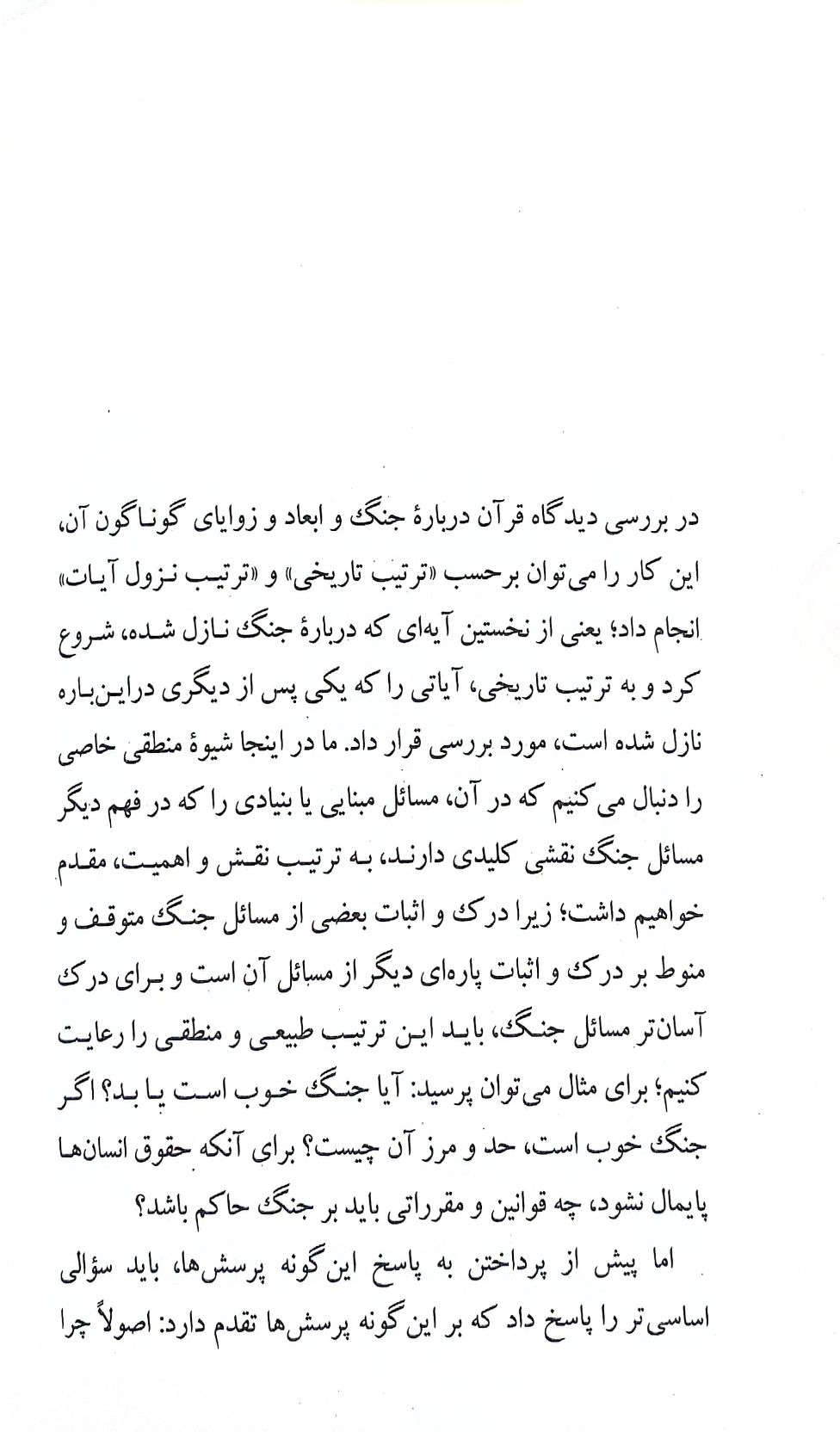 فصل سوم از دریچه نظام تشریع به جنگ مینگرد. این فصل با مسئله جنگ و حفظ حرمت جان انسانها آغاز میشود و ضمن تورق تاریخ به جنگ در ادیان قبل از اسلام میپردازد، مثل: جنگ بنیاسرائیل برای تصرف فلسطین، جنگ طالوت و جالوت، حضرت سلیمان و جهاد و جنگ ایران و روم. این فصل در صفحات پایانی خود تفاوت دفاع و قصاص را تشریح میکند و محدوده قصاص در جنگ را مشخص میسازد.