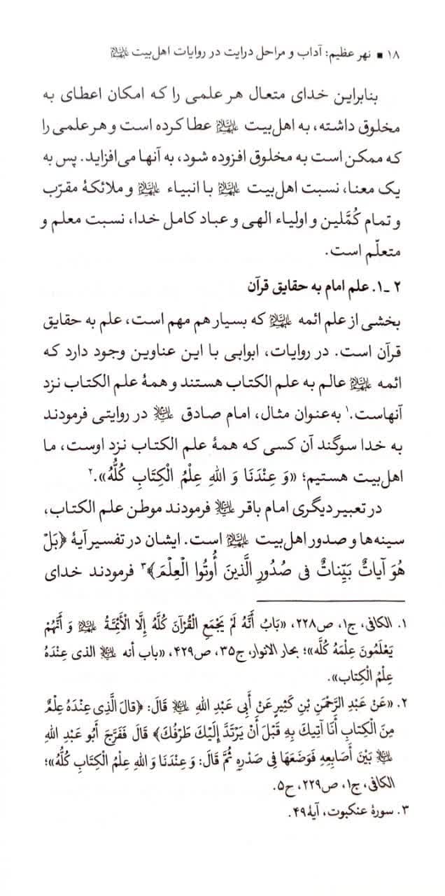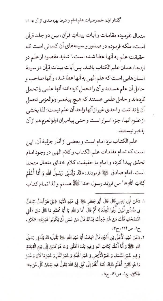 این اثر که مجموعی از سخنان استاد میرباقری است در گفتار اول خود ابتدا وسعت علوم اهل بیت (ع) و ضرورت بهرهمندی از این نهر عظیم را گوشزد میکند تا مخاطب متوجه گردد که خدای متعال هر علمی را که اعطای آن به مخلوق ممکن بوده، به اهل بیت (ع) عطا کرده است و سپس جایگاه عقل، حس و شهود بشری در نسبت با علوم اهل بیت (ع) بیان میشوند.
