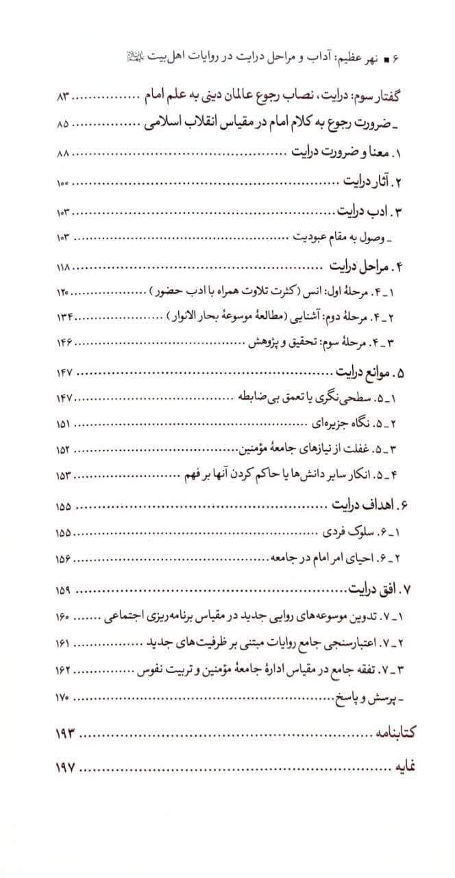 گفتار سوم کتاب درباره درایت در کلام اهل بیت است و از معنا، ضرورت، آثار، آداب، مراحل و موانع درایت و همچنین اهداف پیشرو سخن رانده است. بر اساس این گفتار، وصول به مقام عبد ممتحن و بندگی، ادب باطنی بهرهمندی از انوار علوم اهل بیت (ع) است و حقیقت این بندگی نیز با ورود به دار ولایت و اخلاص در مقام ولایت محقق میشود. آداب ظاهری درایت نیز در سه گام معرفی شدهاند. گام اول انس با روایات اهل بیت و کثرت تلاوت است. گام دوم، مطالعه موسوعه بحار است و گام سوم مرحله تحقیق و پژوهش است. در نهایت سلوک فردی و احیای امر امام در جامعه به عنوان اهداف درایت در کلام امام خاطر نشان شدهاند.