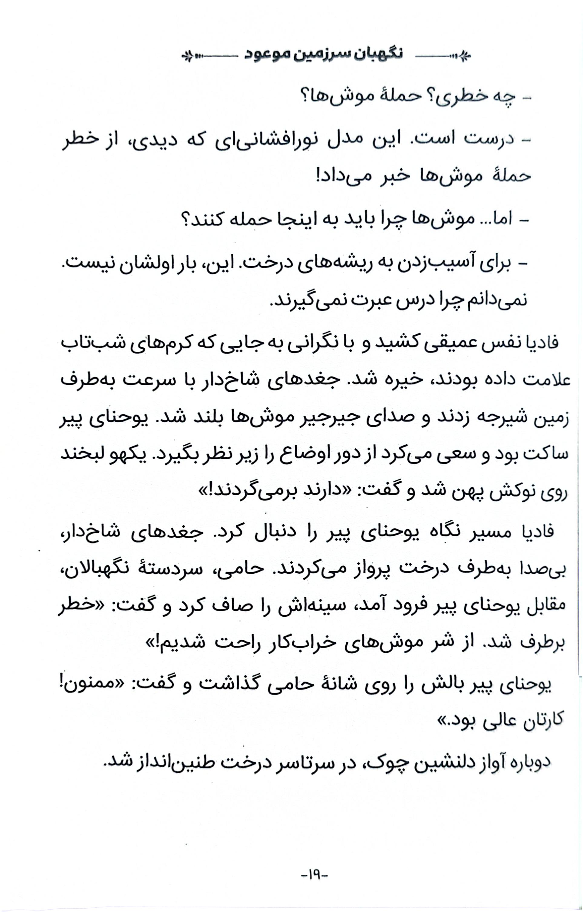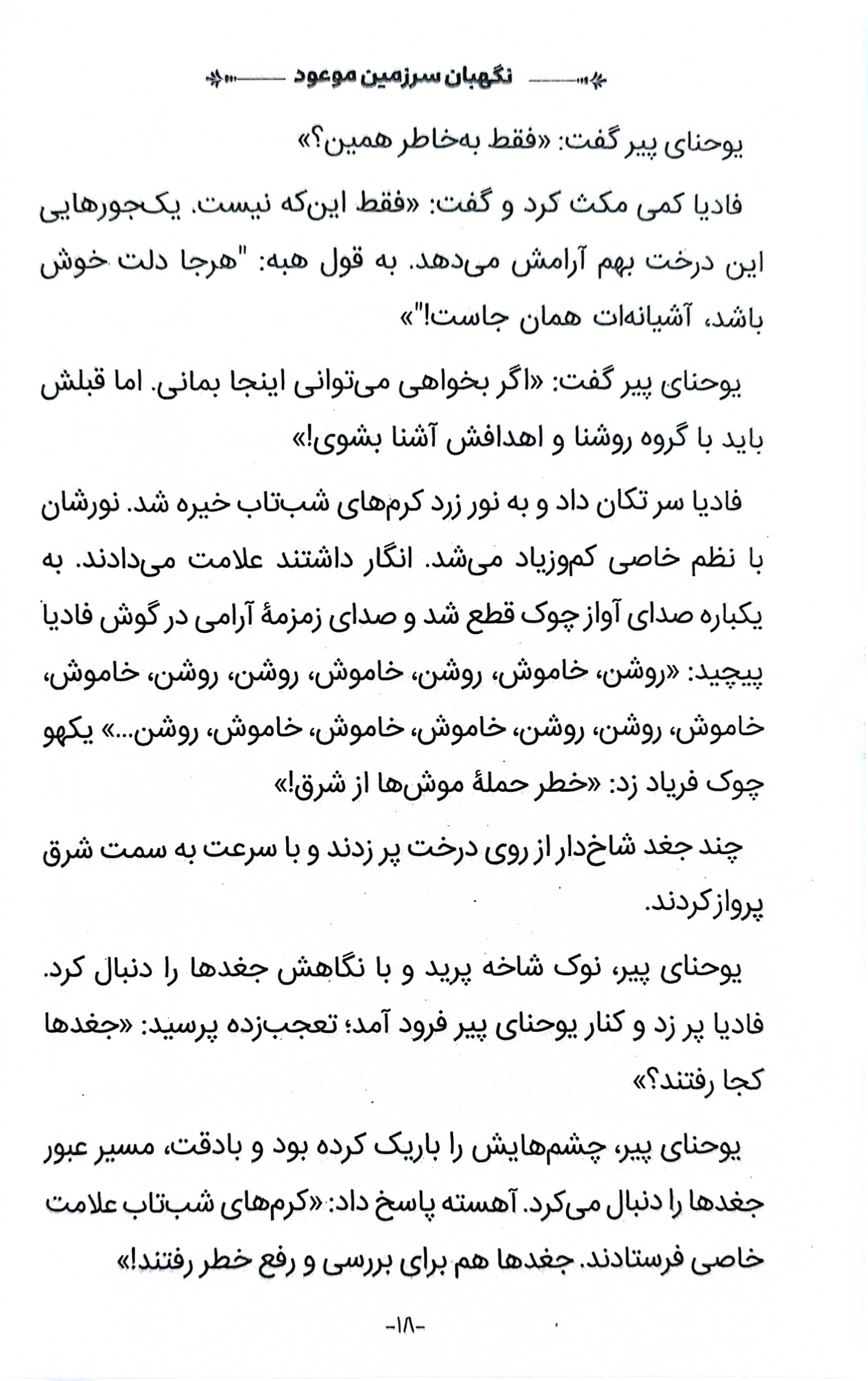 فادیا با خودش فکر کرد نکند این صدا.... صدای منجی است؟ دستپاچه شده بود نمیدانست چه کار کند. سراسیمه از این طرف شاخه به آن طرفش میپرید. دوباره آن صدای دلنشین در گوشش طنین انداز شد: «ای مردم جهان من امام شما هستم کسی هست که مرا یاری کند؟»