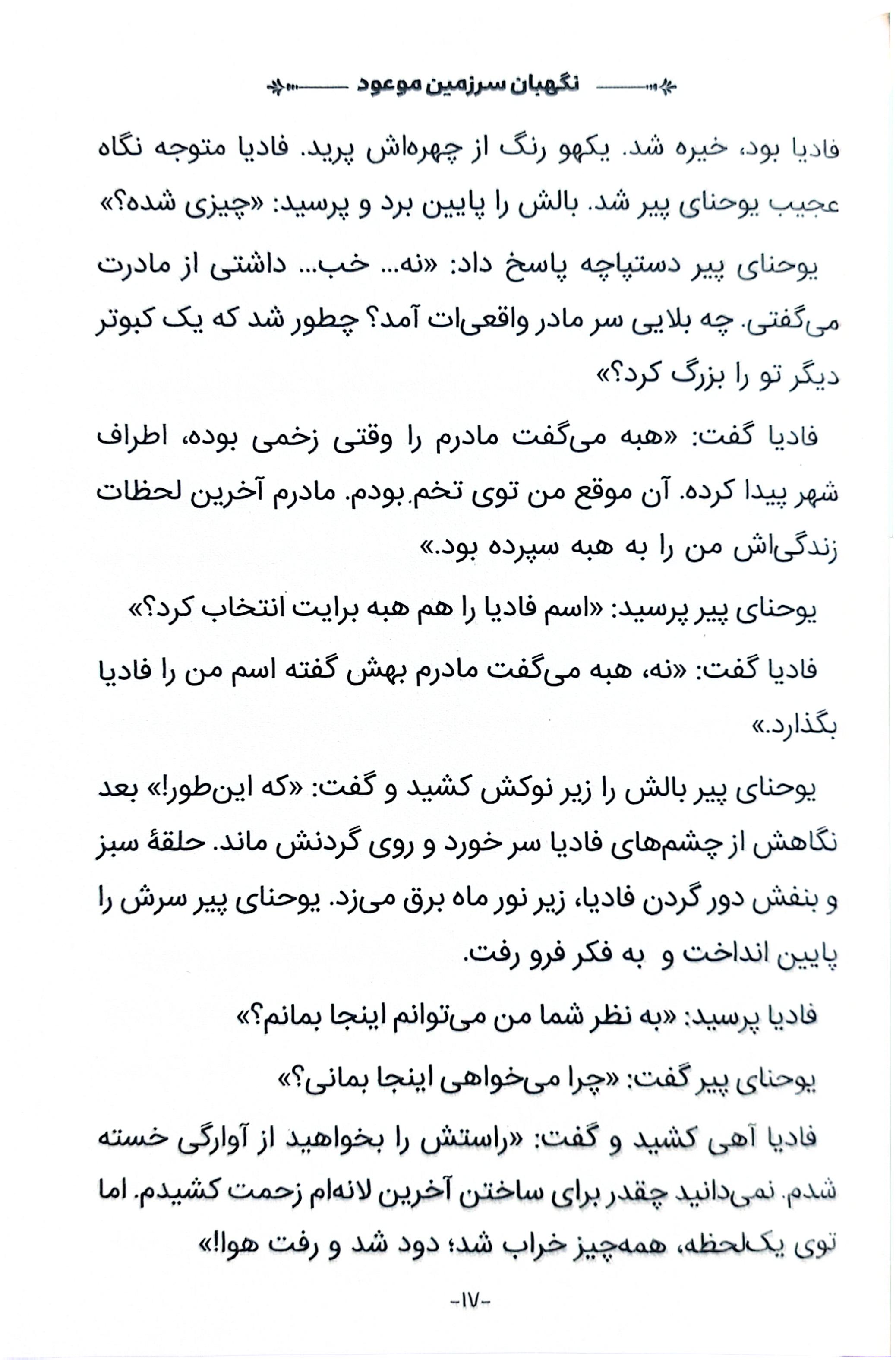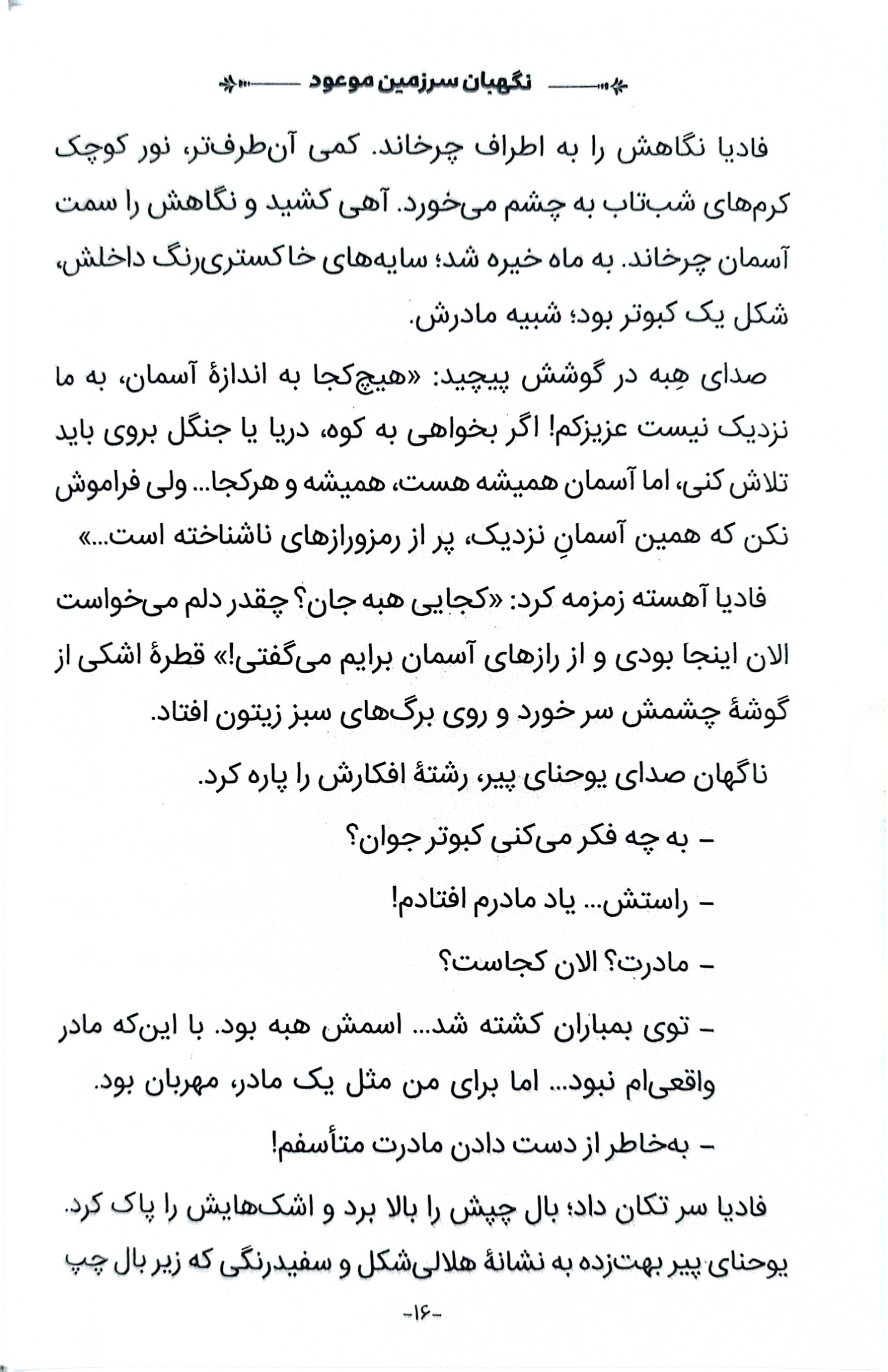 صدا آن قدر گرم و پهناور بود که از گوشها میگذشت و قلبها را نشانه میرفت. قلب فادیا شروع به تپیدن کرد. لحن دلنشین صدا پاهایش را سست کرد و دلش را لرزاند آهسته زمزمه کرد: «بقیة الله ...» مادر بزرگ یک دستش را به قاب پنجره گرفت و دست دیگرش را روی سینهاش گذاشت. زیر لب سلامی گفت و رو به قبله کمی به جلو خم شد. قطره اشکی آرام از گوشه چشمش سر خورد و روی پیراهن گل دارش افتاد.