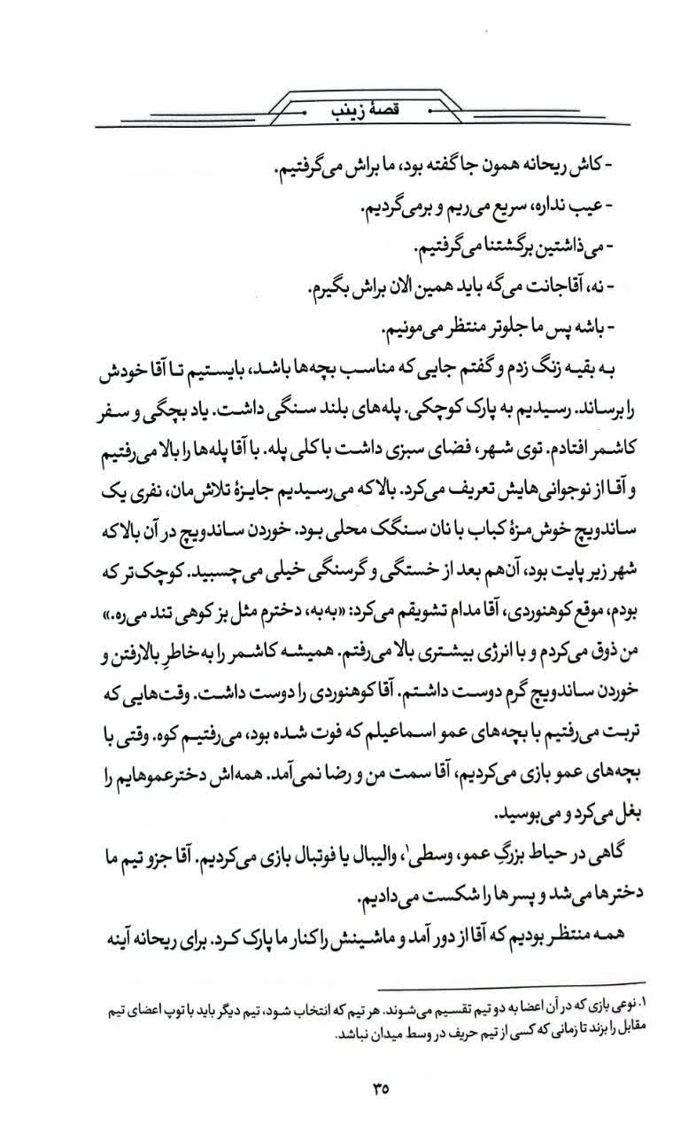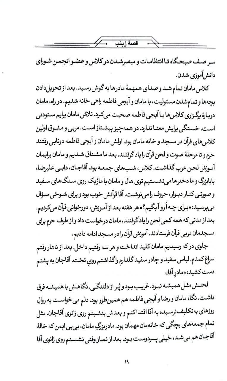 زهرا برای خانمهای بسیجی کلی برنامه داشت که یکی از آنها برگزاری اردوی هفتگی بود. خانم های خانه دار فقط روز جمعه وقت بیکاری دارند. محمد راضی نبود و معتقد بود: «جمعه روز خونواده است مادر باید کنار بچه ها و شوهرش باشه.» زهرا می داند محمد از حرفش کوتاه نخواهد آمد؛ چون از اول ازدواج، یکی از مواردی که خیلی بر آن تأکید داشت این بود که وقتی بعد از کار به خانه می آید او در خانه باشد زهرا در این سالها مراعات میکرد. سعی میکرد اتفاق نیفتد. به نظر او مرد و زن زرنگ کسانی هستند که حساسیتهای همسرشان را بدانند و از خط قرمزها عبور نکنند با این فکرها زهرا به یقین رسید که باید برنامه اردو را برای پنج شنبه بگذارد.