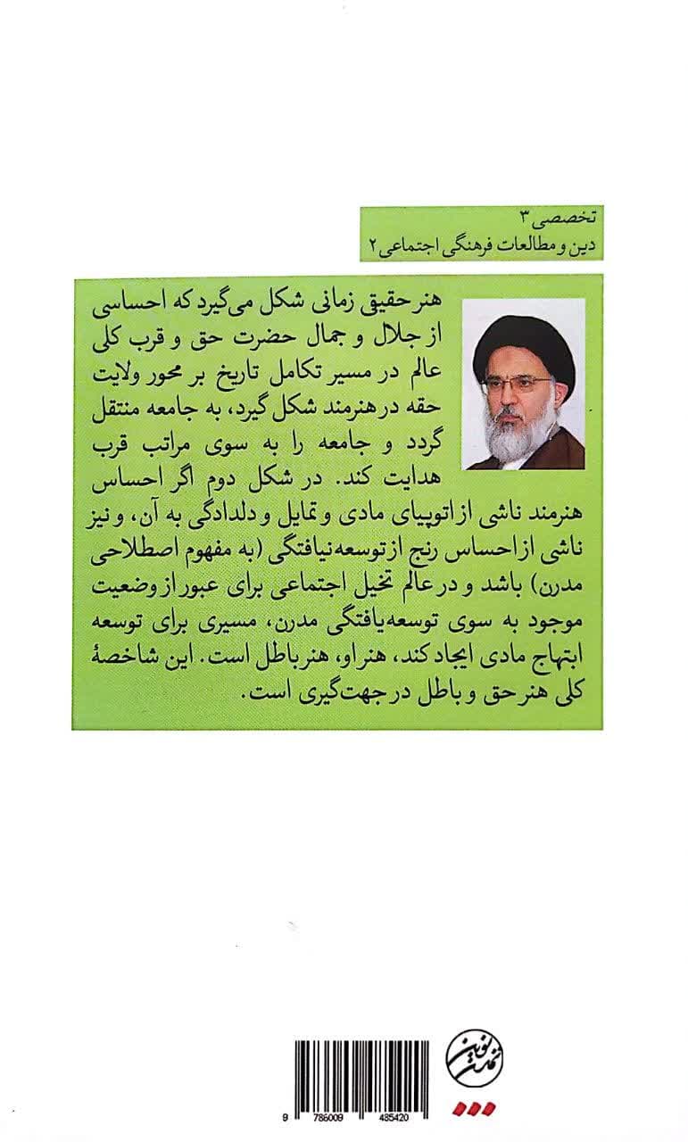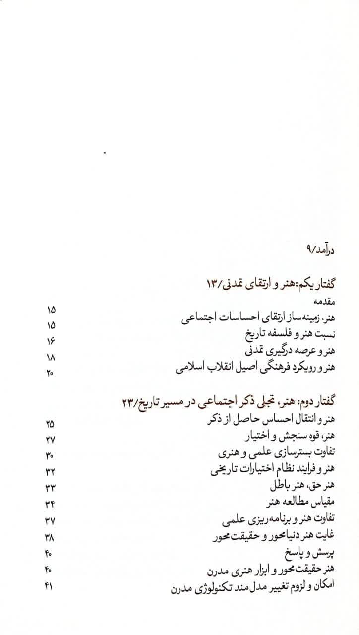کتاب حاضر هنر را زمینهساز ارتقای احساسات اجتماعی معرفی میکند و از نسبت هنر و فلسفه تاریخ، هنر و عرصه درگیری تمدنی، هنر و رویکرد فرهنگی اصیل انقلاب اسلامی میگوید. د ر ادامه هنرِ قرآن عامل تکامل هنر در تاریخ معرفی میشود، نگاه «خرد، کلان و توسعه» به هنر واکاوی میشود، هنر مدرن به عنوان عامل تحقیر ارزشها بررسی میشود و با طرح موضوعاتی از این قبیل فلسفه جامعی از هنر حق ارائه میشود.