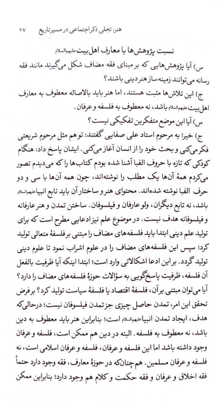 پرسشهای فراوانی از این دست و فقدان فلسفه هنر و زیباییشناسی و فلسفه و تاریخ خاص هنر مبتنی بر معارف اسلامی مشکل هنر کنونی جامعه ماست. استاد میرباقری در کتاب حاضر کوشیدهاند این خلا را پر کنند تا از این رهگذر دو اتفاق عمده صورت گیرد:
