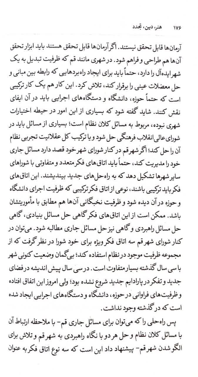هنر مدرن با همه ویژگیهایش یکی از نقاط چالش مورد اشاره است. همان گونه که در علم اقتصاد هم مادامی که چالش بین علم اقتصاد و ارزشهای اقتصادی شناخته نشود نقطه اختلاف و درگیری شروع نمیشود؛ به عبارت دیگر نقطه بحران شناخته نمیشود تا راهحلی طراحی شود؛ در مورد هنر هم همین مسئله وجود دارد؛ یعنی چالش بین ارزشهای مذهبی و هنر مدرن گستره فلسفه هنر تا تکنولوژی هنر را در برمی گیرد. ابتدا باید این نقطه چالش را یافت. بنابراین علت سامان نیافتن مقولاتی مانند هنر یا اقتصاد چالش میان عقلانیت جدید و هنر مدرن با ارزشهای دینی است.