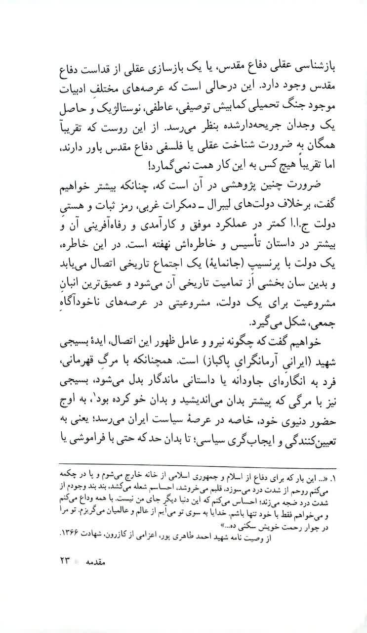 بر مبنای اندیشههای سید جواد طاهایی ضروریترین ضرورتها در تاریخ جدید کشور آن باشد که باید به عظمتِ فلسفیِ انسانی که زمانی به ظهور رسیده بود برسیم و سپس به تبلورات آن اندیشیده شود. این مطالب در فصلهای اول و دوم کتاب تبیین شدهاند. پاسخ به سوالاتی چون: «چگونگی تداوم انگاره بسیجی شهید، تداوم انقلاب اسلامی و پیش از آن، تداوم جمهوری اسلامی است؟» و « چگونه بسیجی شهید یا تفکری که به او ارجاع دارد، ایجابگر مسیرهای آتی سیاست در نظام جمهوری اسلامی تواند بود؟»