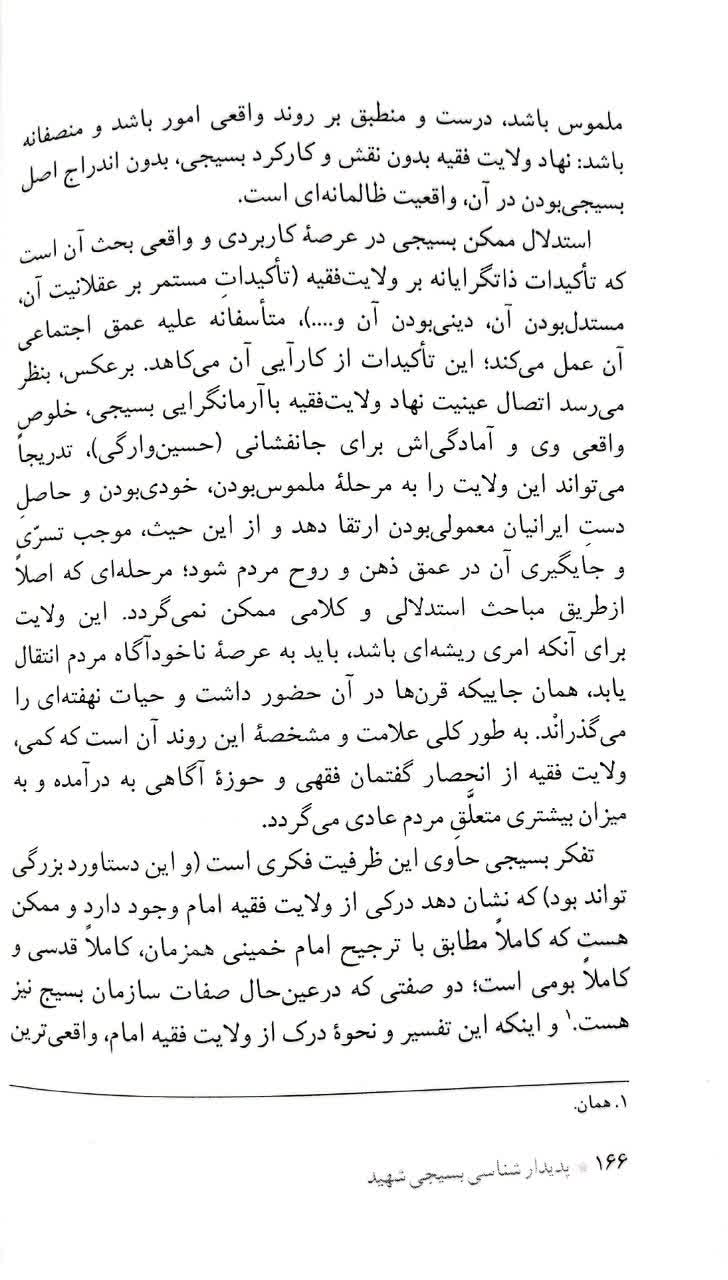 بدین نحو انگاره انسان ویژه انقلاب اسلامی نه فقط دارای قوه استمرار در ذهنیت نسلهای جامعه ایرانی است بلکه بسیار فراتر از آن، انحرافات و نقیضها از خود را نیز برجسته میسازد و آن را درون وجدان و آگاهی افراد وارد میسازد و بدینگونه بنیادی برای اصلاح آن در دوره بعدی فراهم میآورد. این شاید اصلی ترین معنای استمرار تفکر بسیجی یا همانا خاطره انسان الگوی ایرانی در سیاست کشور باشد. اگر بسیجی چنین انسانی باشد از طریق جنگ تعریف نمیشود.