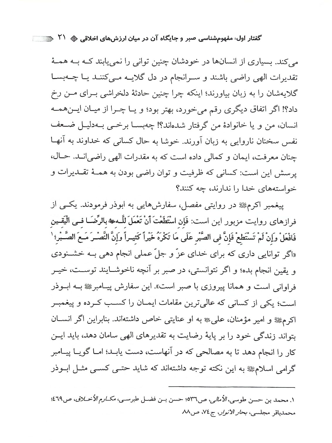 این اثر که حاصل درسهای اخلاق علامه مصباح یزدی است، در ۲۷ گفتار مدون، آناتومیِ صبر را تشریح میکند. ویژگی بارز کتاب این است که از کلیگویی پرهیز کرده و وارد جزئیات کاربردی شده است: ۱. چیستی: تبیین حقیقت صبر و تفاوت آن با انفعال. ۲. چرایی: بررسی فضیلت و ضرورت آن در نظام اخلاقی. ۳. چگونگی: ارائه متدها و روشهای عملی برای ایجاد و تقویت روحیهی صبر.