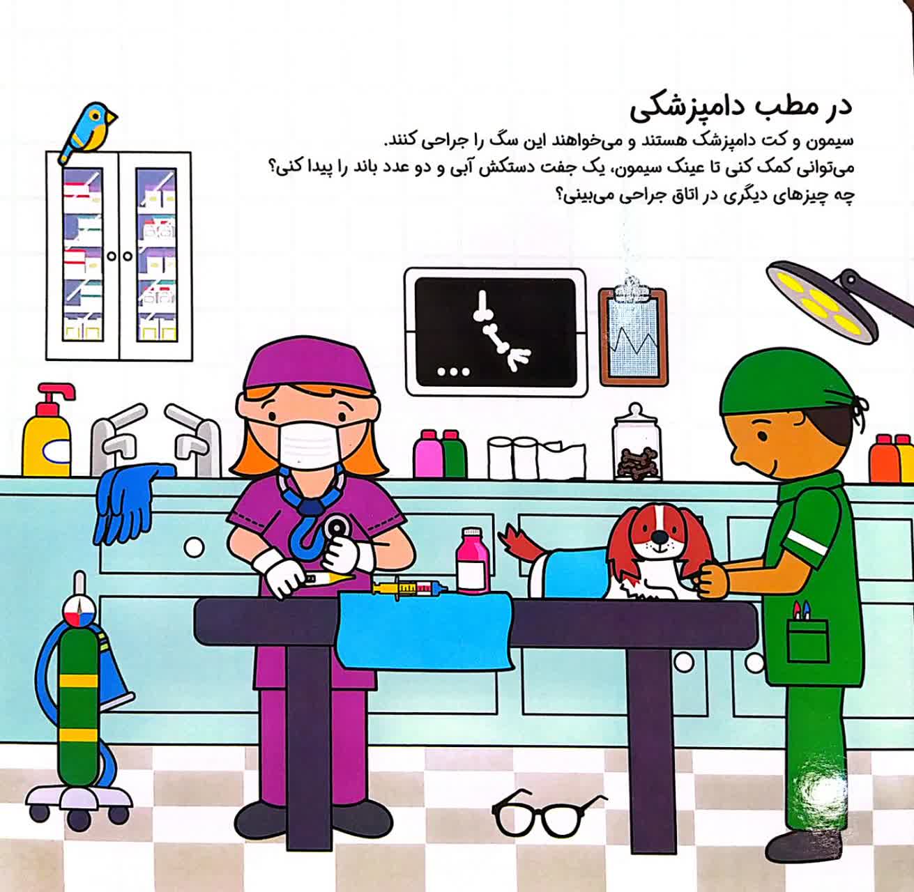 سیمون و کت دامپزشک هستند و میخواهند این سگ را جراحی کنند. میتوانی کمک کنی تا عینک سیمون یک جفت دستکش آبی و دو عدد باند را پیدا کنی؟ چه چیزهای دیگری در اتاق جراحی میبینی؟