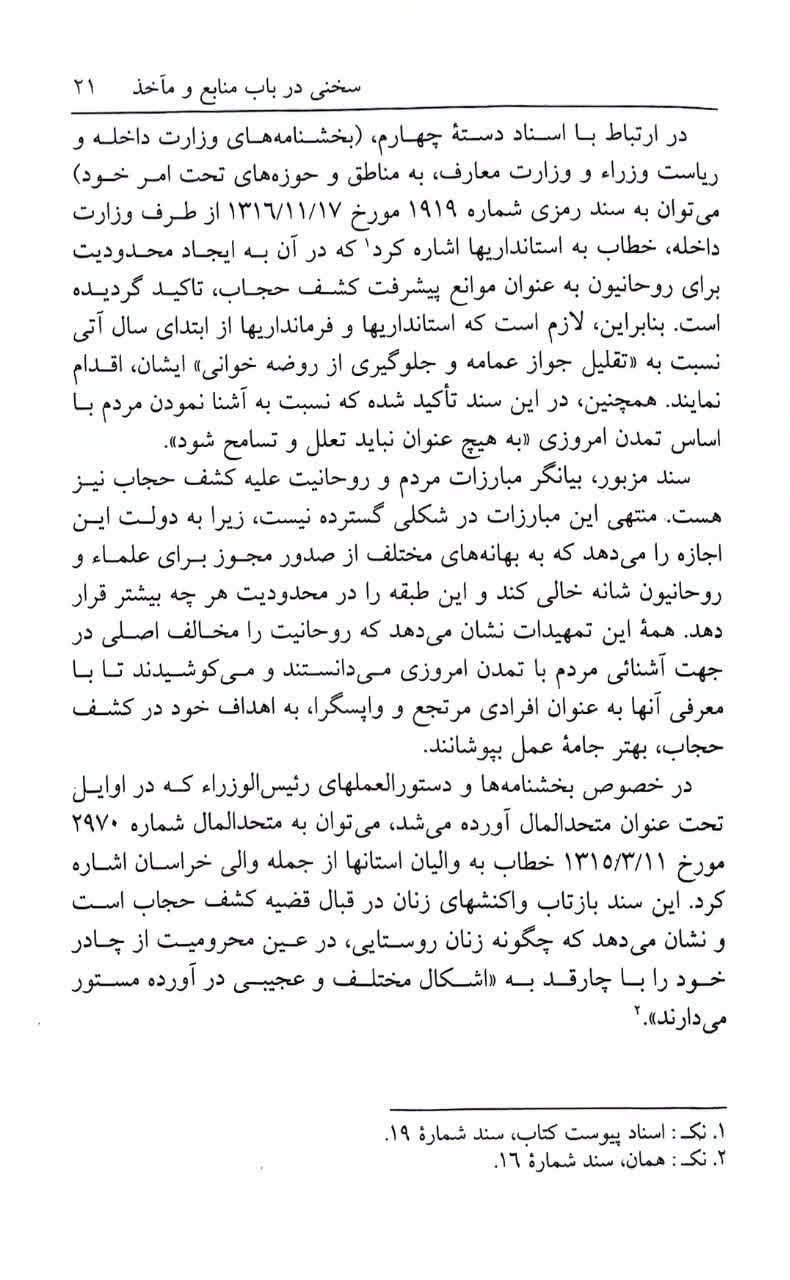 مقدمه کتاب در بحث نسبتا مفصلی به بررسی منابع مختلف کتاب میپردازد و از اتقان آنها سخن میگوید. سپس در فصل اول قضیه کشف حجاب از دیدگاه تجدد طلبان قاجار مورد توجه قرار گرفته است و نظریات آنها در خصوص کشف حجاب بررسی گشته است. از آنجایی که این اقدامات زمینه را برای اقدامات تجدد طلبانه رضا شاه فراهم ساخته است، کشف حجاب رضاخانی را باید در امتداد تجدد طلبی قاجار تحلیل کرد.