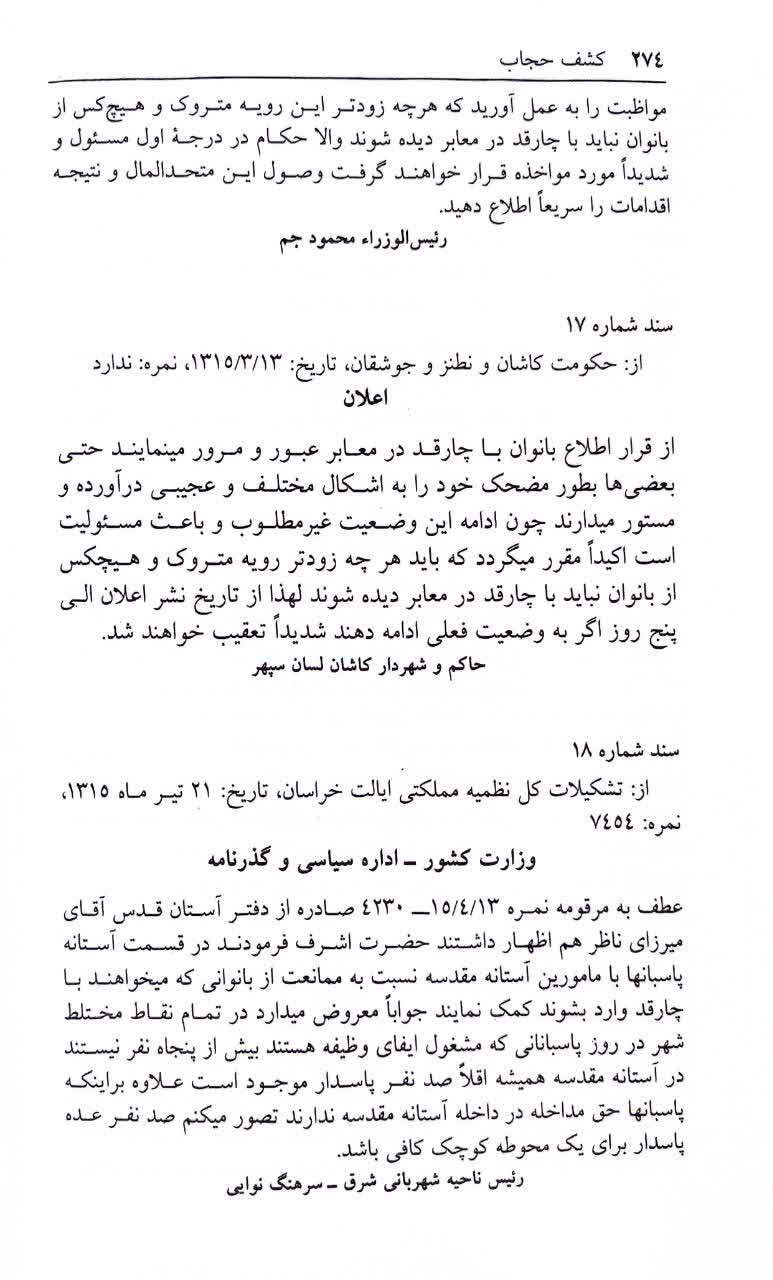 گزافه نیست اگر بگوییم تاریخ ایران پیش از انقلاب را مردان نوشتهاند و زنان تاثیری در اجتماع نداشتهاند. اما این خانهنشینی زنان به علت حجاب آنها نبوده است. حجاب عاملی برای محدودیت نبوده و نیست، بلکه مصونیت است. با این حال رضاشاه در سفر به ترکیه و فرنگ عامل پیشرفت آنها را در بیحجابی میدانست. این شد که پروژه حجاب زدایی را در ایران پی گرفت. در دی ماه 1314 با حضور بدون حجاب خانواده شاه، کشف حجاب علنا به نمایش گذاشته شد و سپس از سوی شاه رسما داشتن حجاب منع گردید. جامعه اسلامی ایران این قانون ضمخت را هرگز برنتابید و شدت نارضایتیها را افزایش داد. کتاب حاضر چند و چون این واقعه را به خوبی واکاوی میکند.