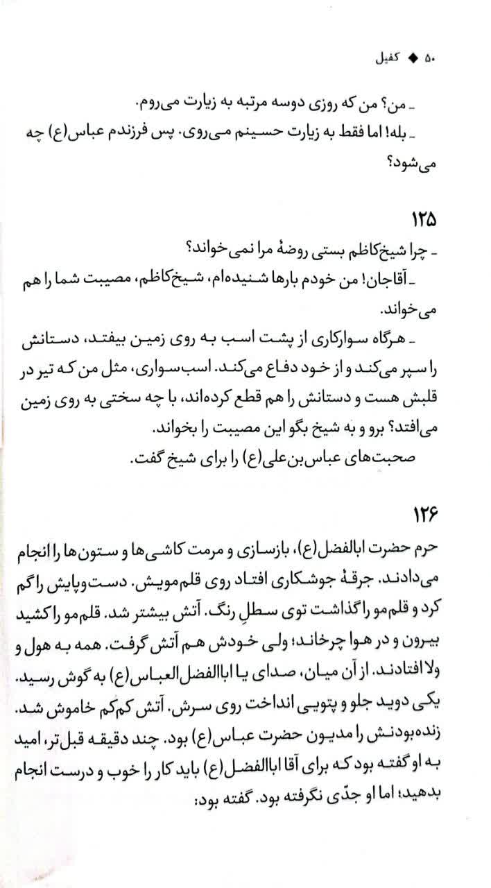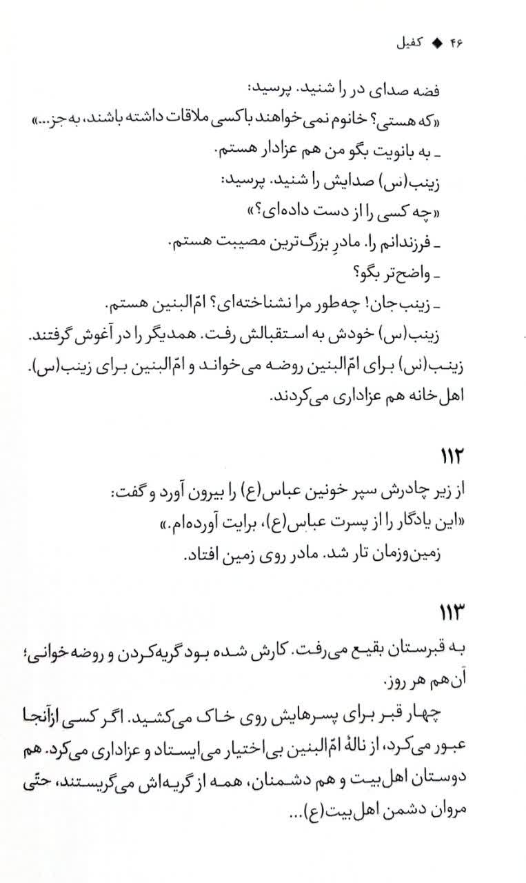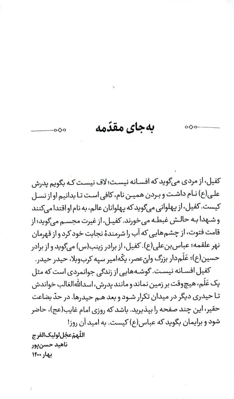 کتاب کفیل طعمی است از همین جنس. از جنس مردانگی حضرت ابوالفضل (ع)، از جنس شجاعتش، از جنس ادبش و عظمتش. روایتهای کفیل گاه از مستجابالدعوه بودن حضرت میگویند، گاه از جنگاوری ایشان میگویند، گاه روضهای مصور هستند و از صدای اشکهای حسین (ع) بر پیکر برادر میگویند و گاه ...