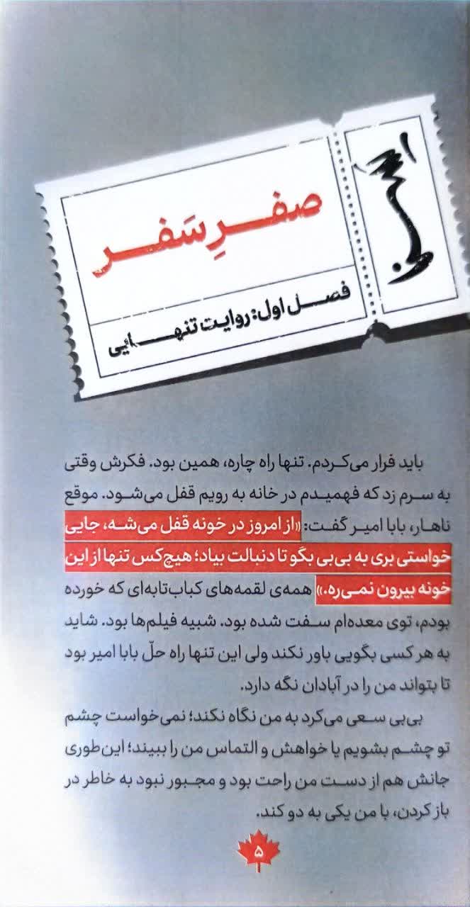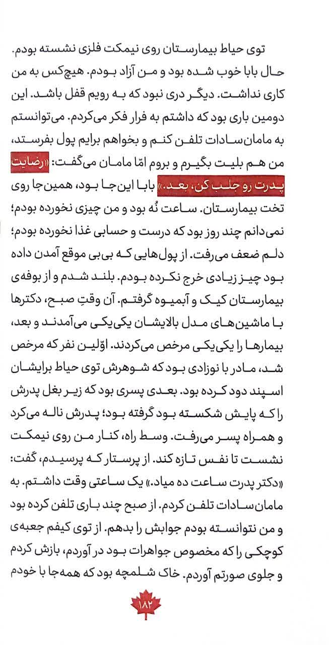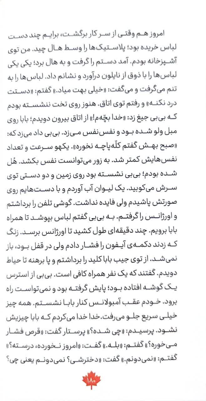 ما دیگه مثل هم نیستیم. من نمی‌توونم توی هر مهمونی بیام یا هر مهمونی اومد مثل قبل باشم. بیا من رو همین طوری که هستم قبول کن. قبول کن که من یسنای قبل نیستم. بابا پیشانی‌اش را توی دو دستش گرفته بود. بی‌بی گفت: «دختره چشم سفید ایقد این بابا تو حرص نده خو». بابا سرش را بالا آورد و گفت: این حرفا رو هم مادرت یادت داده؟ دیگه چه کارت کنم خو؟ چادر که سرت می‌کنی! مهمونی که نمیای! آبروی منو بردی همه جا! یه باره بگو منم مثل تو بشم و خلاص.